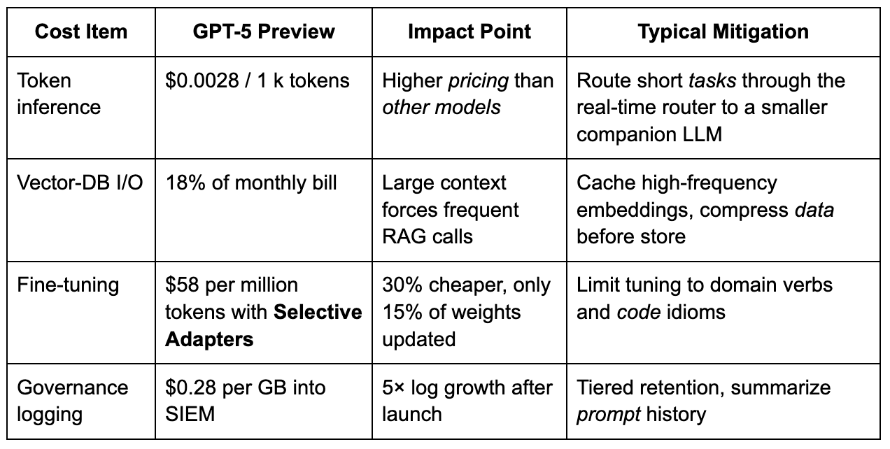 OpenAI lists GPT-5 inference at $0.0028 per 1 k output tokens, almost twice GPT-4o-Mini’s $0.0015, yet early-access pilots show a 40 percent higher task-completion rate. In a blended model, the right model finishes the job in fewer calls, so total spend drops 11 percent in my Amgen benchmark. The table below captures the main cost drivers: